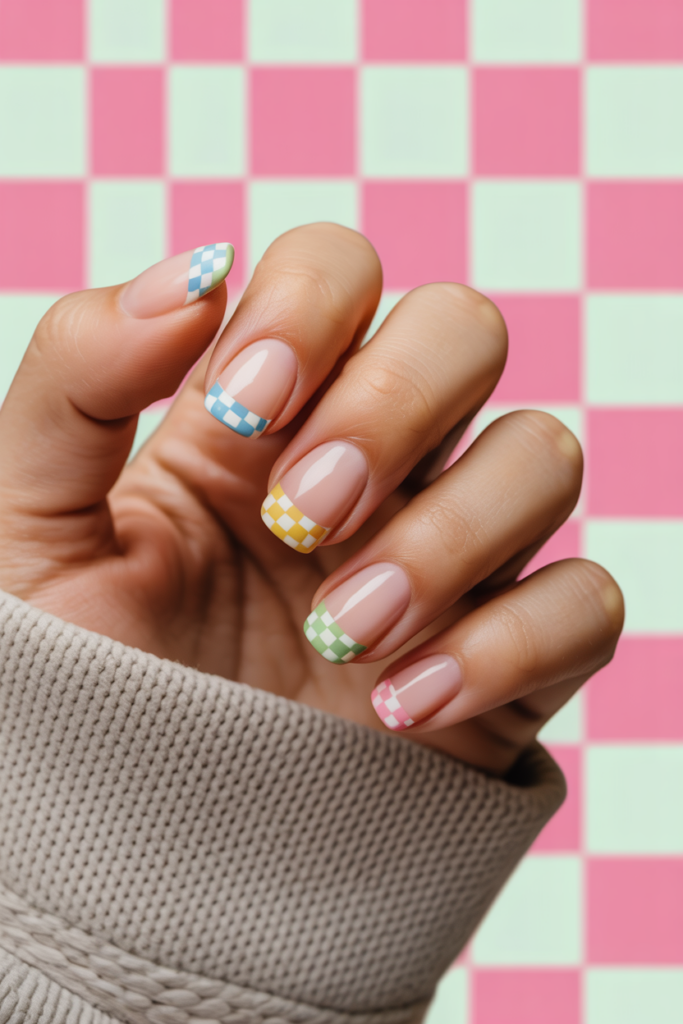 20) French tips with pastel checkerboard