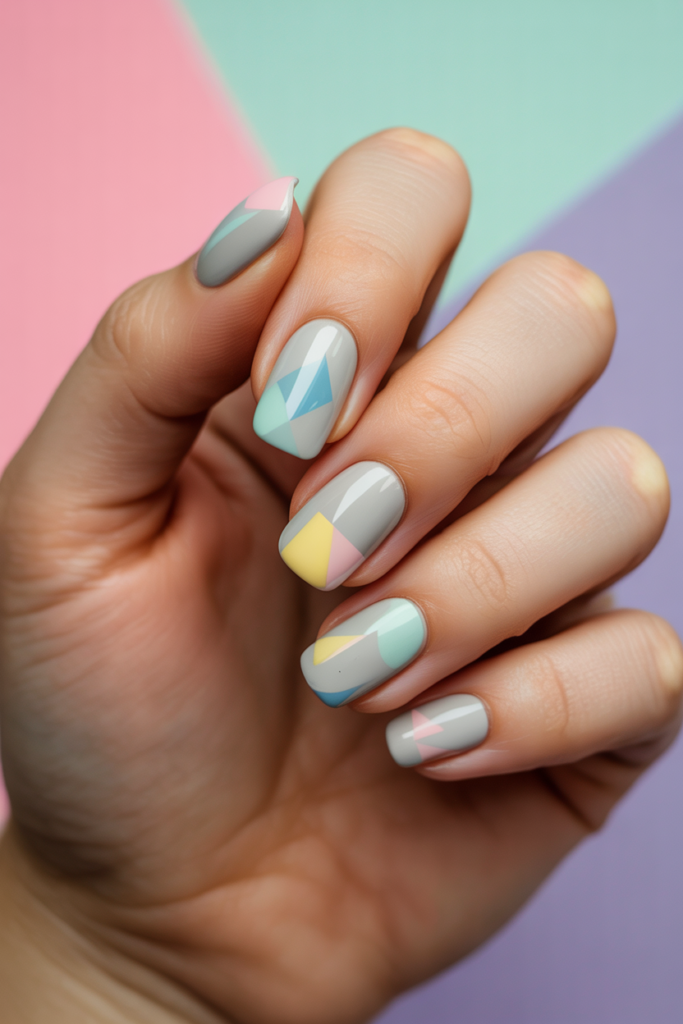 This design pairs a soft light grey base with simple pastel geometric shapes. The colors add subtle contrast without being too bold.