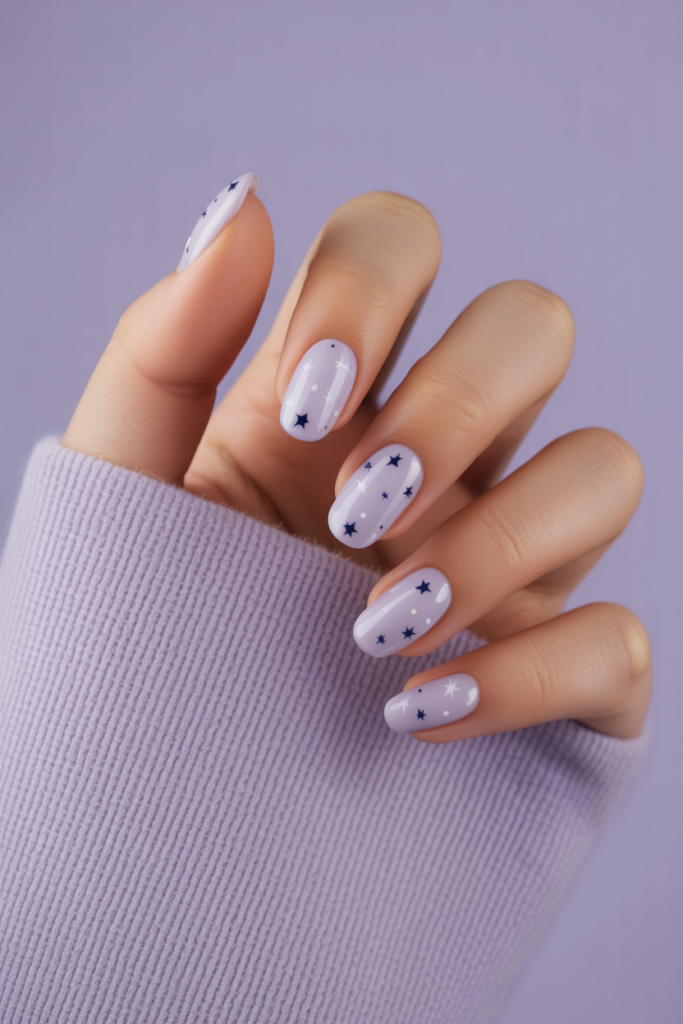 Light lavender nails offer a soft, calming base. Adding tiny stars creates a subtle, playful touch.
