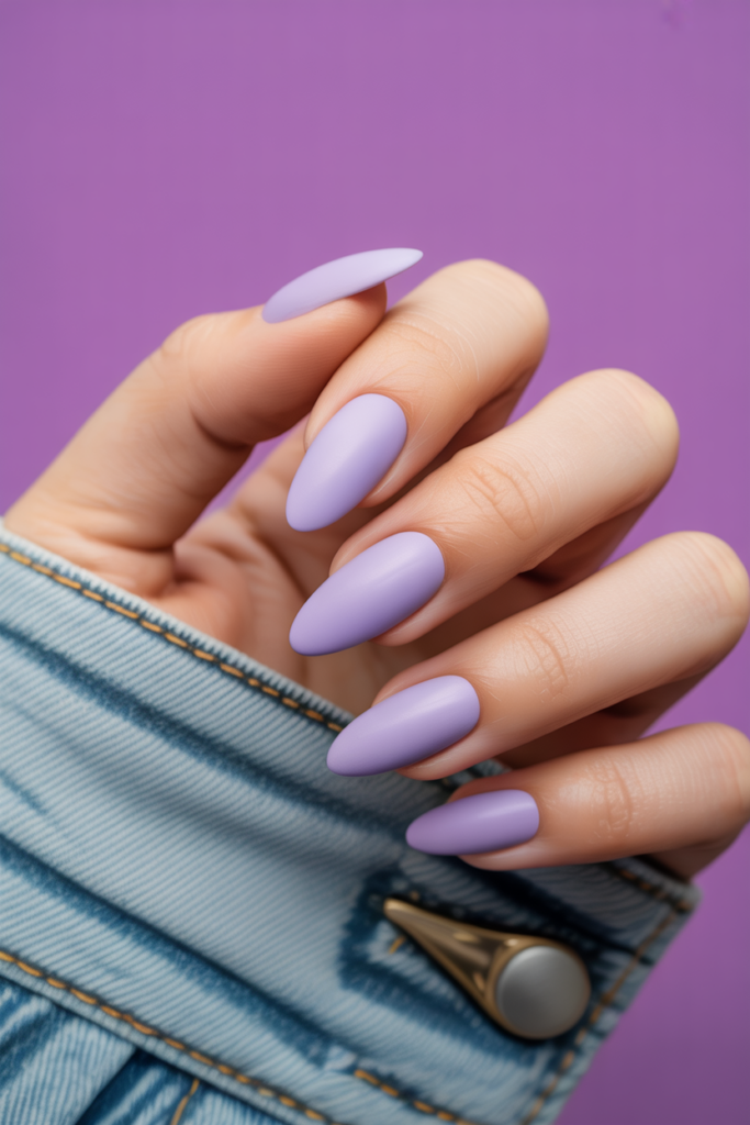 Matte lavender nails offer a soft, modern look that suits spring well. The almond shape adds elegance while keeping nails practical.