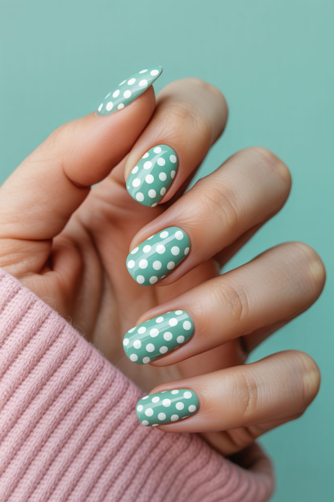 This look pairs a soft mint green base with crisp white polka dots. It offers a fresh, playful style perfect for spring. The dots add a simple but charming detail that balances well with the pastel color. It works well on all nail shapes and lengths.