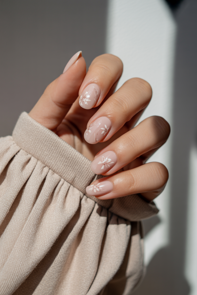 This look uses a soft nude base that suits any skin tone. The floral accents are small and detailed, adding a gentle touch without overpowering.