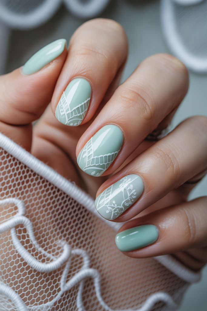 13) Pale mint with delicate white lace art