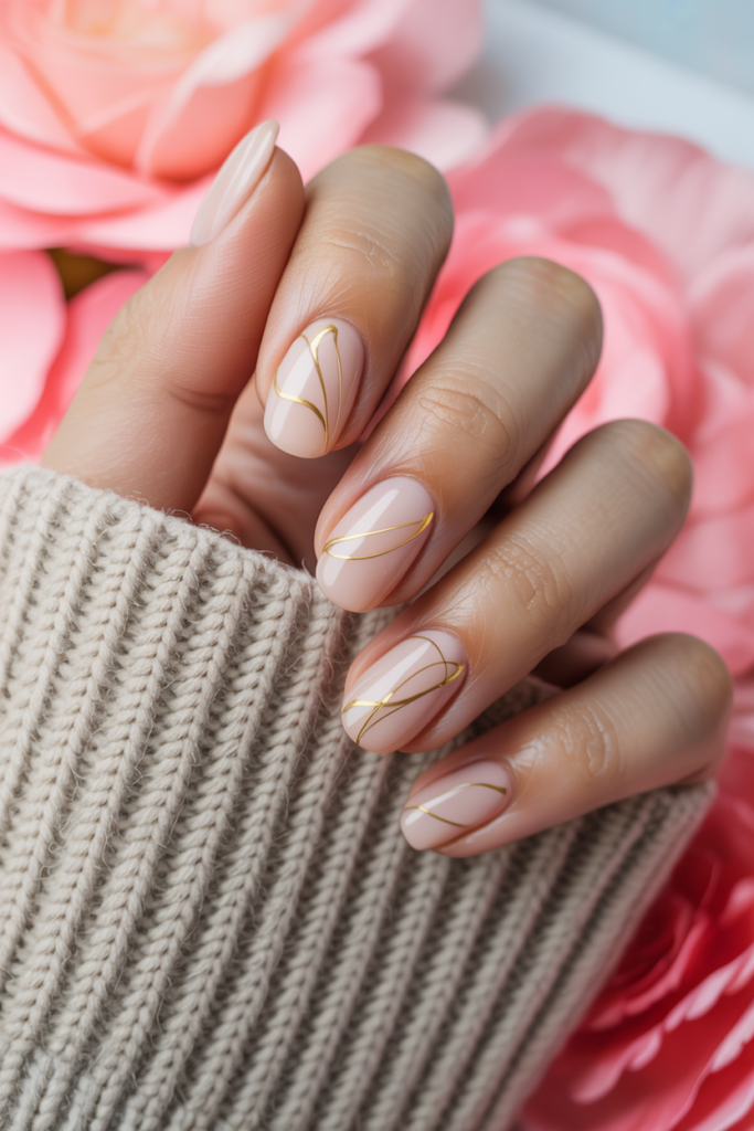 Pale peach nails offer a soft, elegant base perfect for spring. The gold line art adds a touch of sophistication without being too bold. This combination works well for both casual and formal occasions, giving nails a polished and modern look.