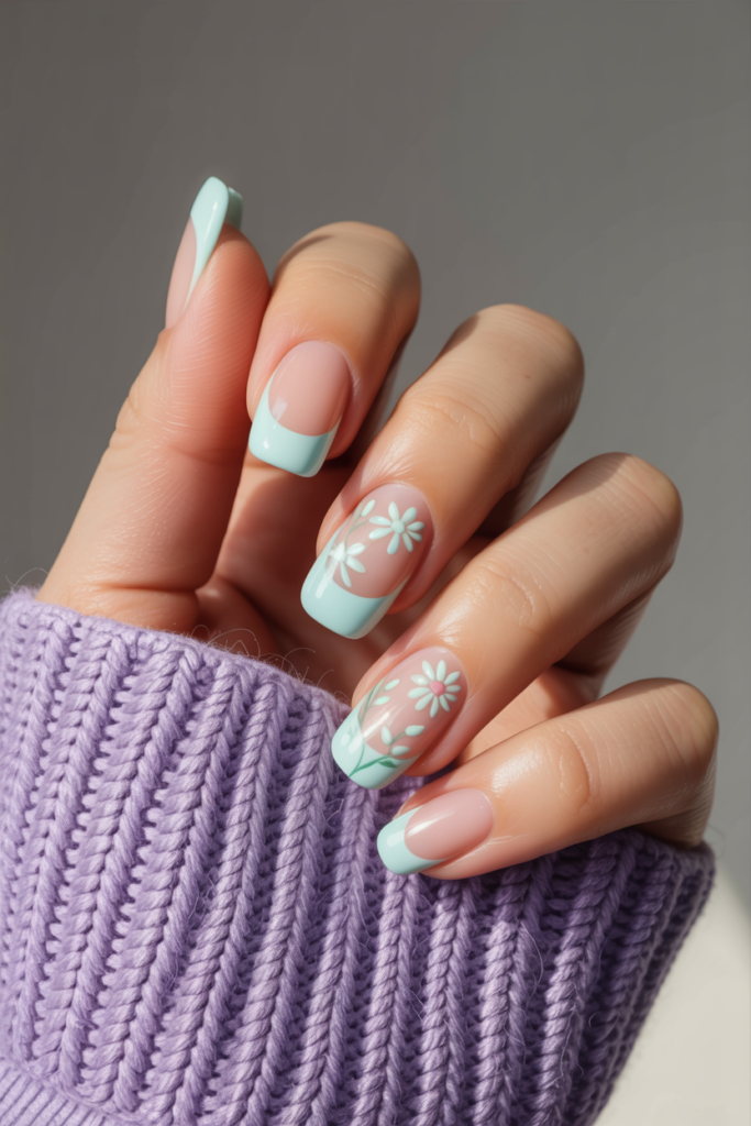 1) Pastel French tips with floral accents