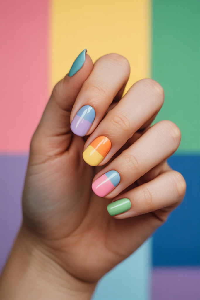 They create a soft, playful look using several pastel shades on different nails. Each nail has a clean block of color, from light pinks to gentle blues and yellows. This style adds variety while keeping the overall design calm and wearable for spring.