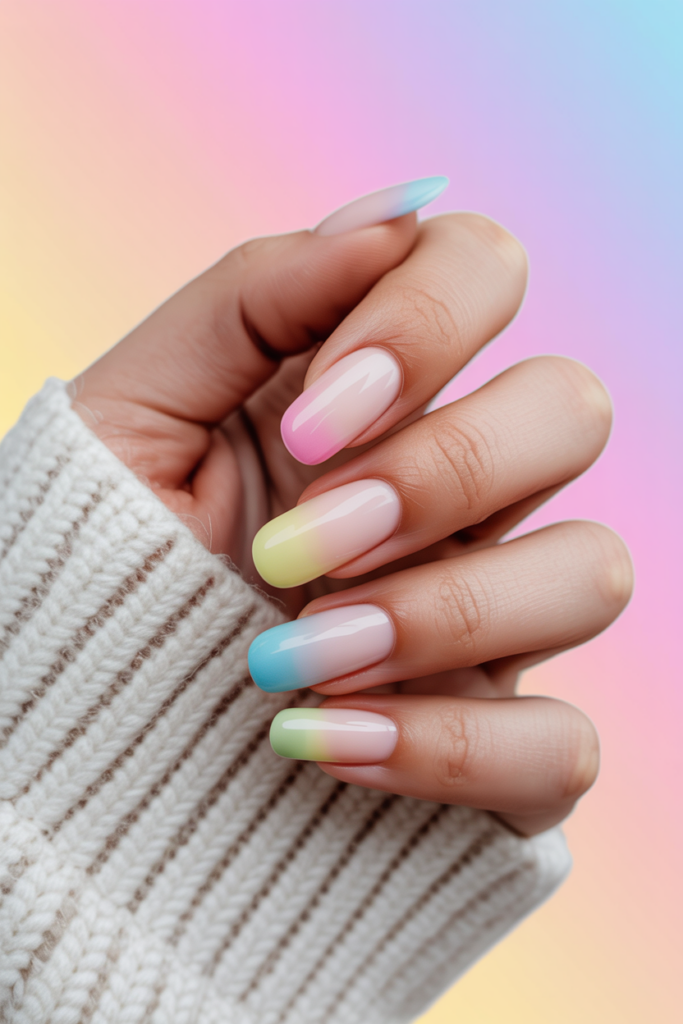 This look combines a clean, sheer white base with soft pastel colors on the tips. The gentle fade adds a fresh, light touch that fits well with spring themes.