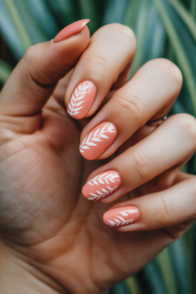 Soft coral nails paired with delicate leaf patterns create a fresh and natural look. This design fits well with spring’s gentle vibe.