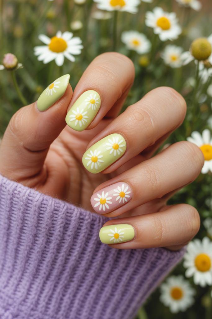 Soft yellow nails create a gentle and fresh base for spring. Daisy decals add a simple, charming touch. This look feels light and perfect for everyday wear.