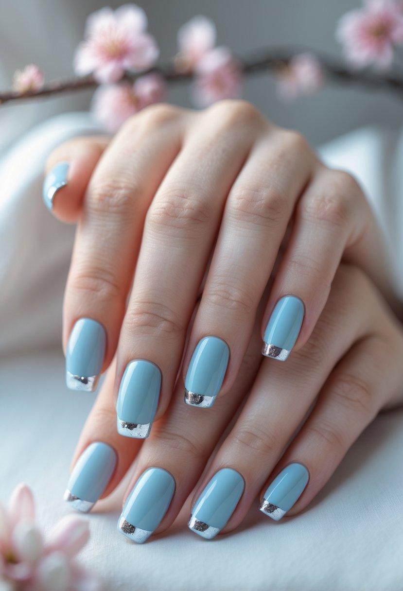 This look pairs soft powder blue with sleek silver tips for a simple yet stylish design. The gentle blue creates a calm base while the silver adds a modern shine.