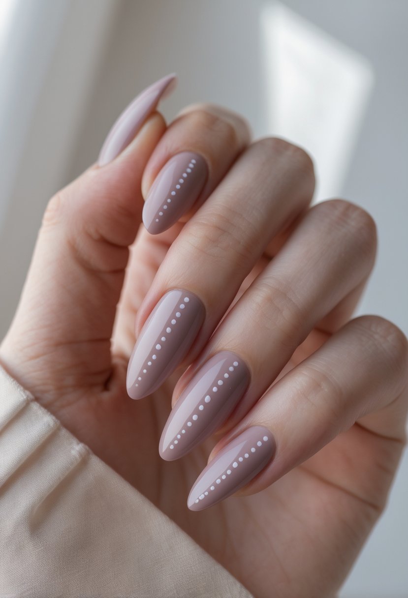 Soft mauve nails offer a gentle, elegant base. Adding small, minimalistic dots keeps the look simple yet modern.