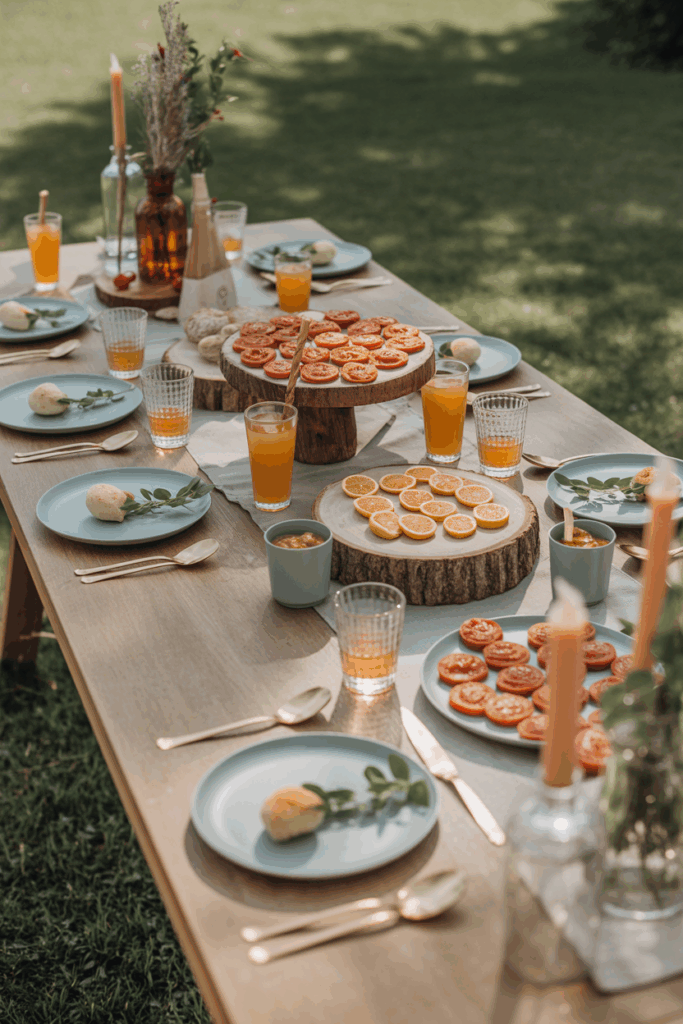 When planning an outdoor party, choosing sustainable supplies can make a big difference. The image shows a lovely setup with eco-friendly materials that are both stylish and practical. You can see cute little plant decorations and reusable containers that add a natural touch.