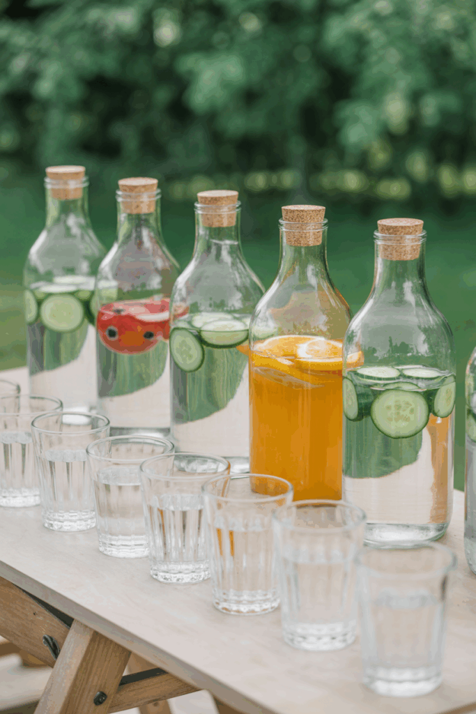 Staying hydrated at an outdoor party is key, and a well-set water station can make all the difference. The image shows a stylish setup with various infused water options, perfect for quenching thirst on a warm day.