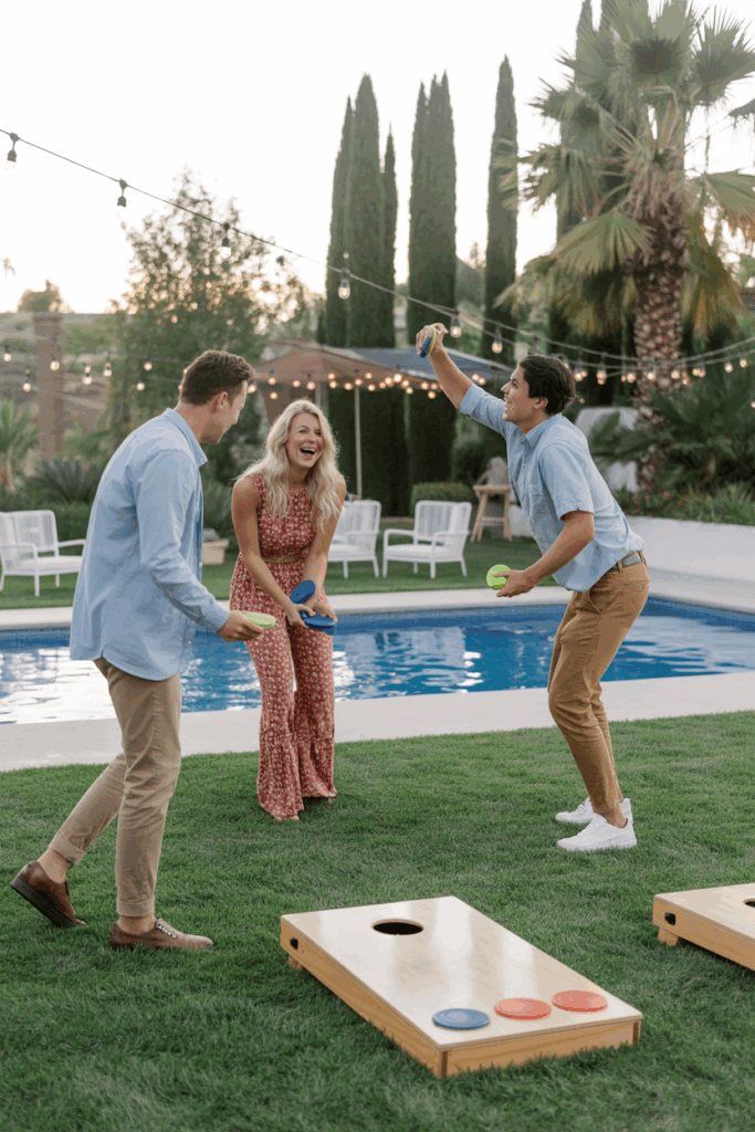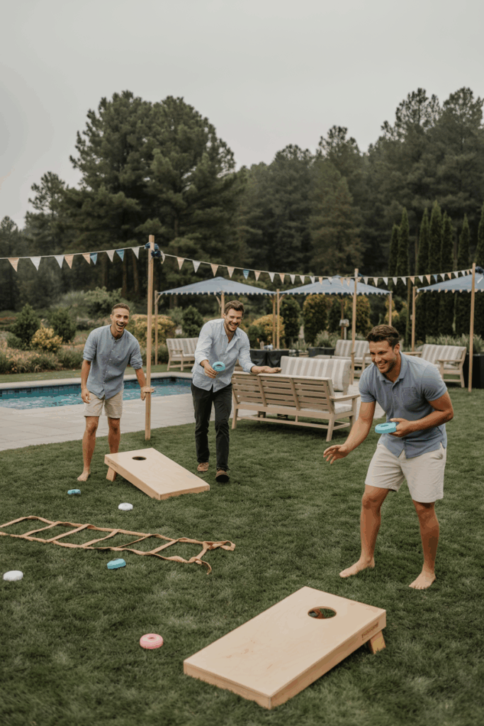 In the background, there’s a beautiful green lawn surrounded by trees, making it a perfect setting for a gathering. The players are engaged and having a great time, which adds to the cheerful vibe of the party. Having games like cornhole not only brings out a friendly competition but also encourages social interaction.