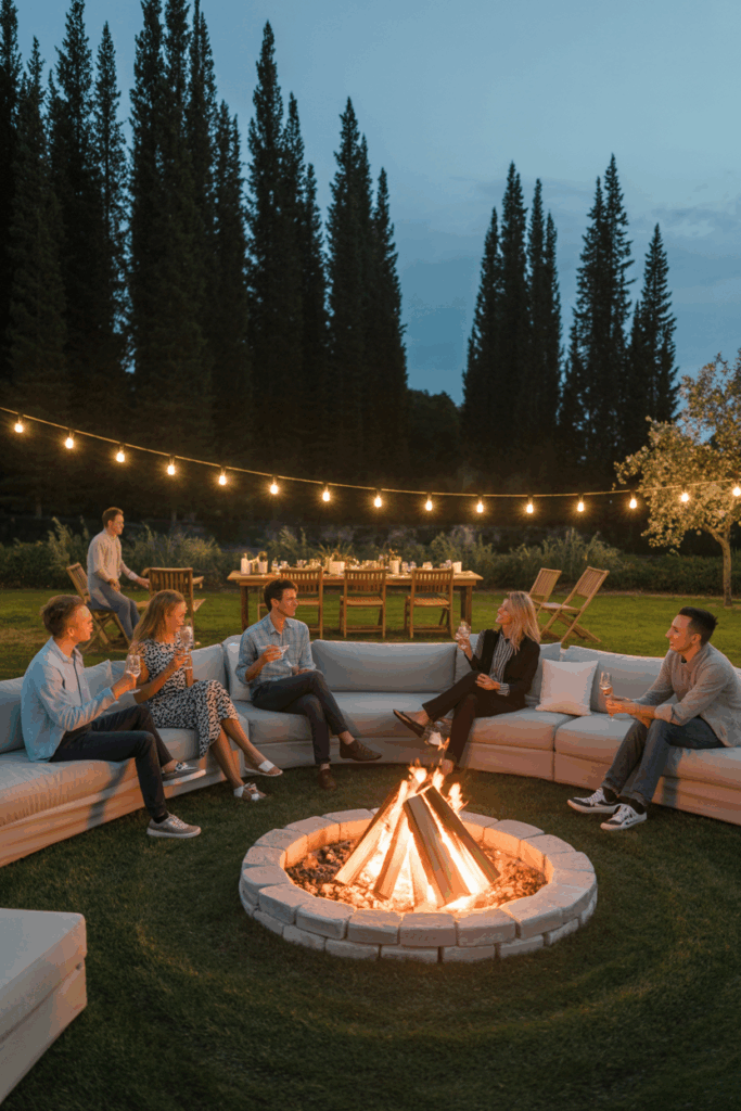 A fire pit is a fantastic addition to any outdoor party. It creates a warm and inviting space for friends and family to gather. In the image, a group of people enjoys the glow of a fire, surrounded by a rustic setting. The fire pit is surrounded by a stone ring, which adds a touch of style and safety.