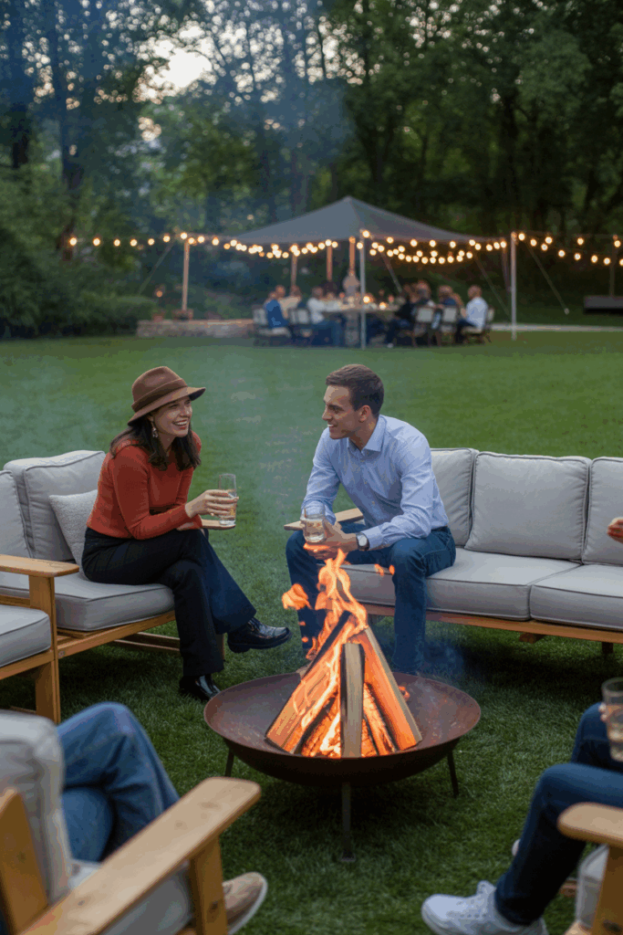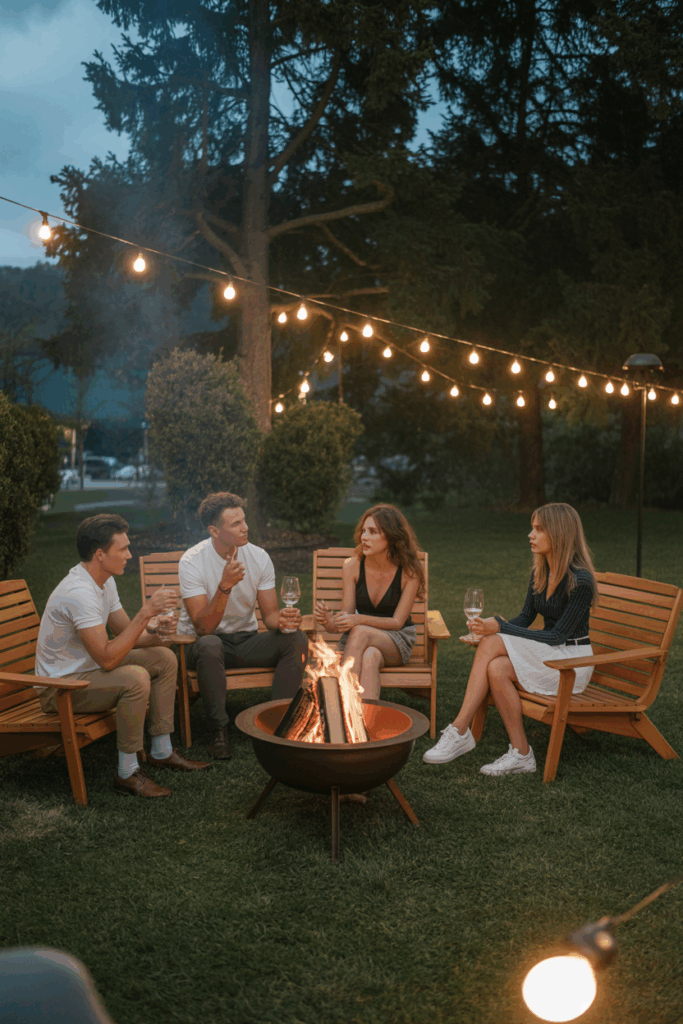 Everyone looks relaxed and engaged, sharing stories and laughter. The cozy atmosphere encourages connection and fun. The soft glow of the flames lights up their faces, making it the perfect backdrop for memorable moments.