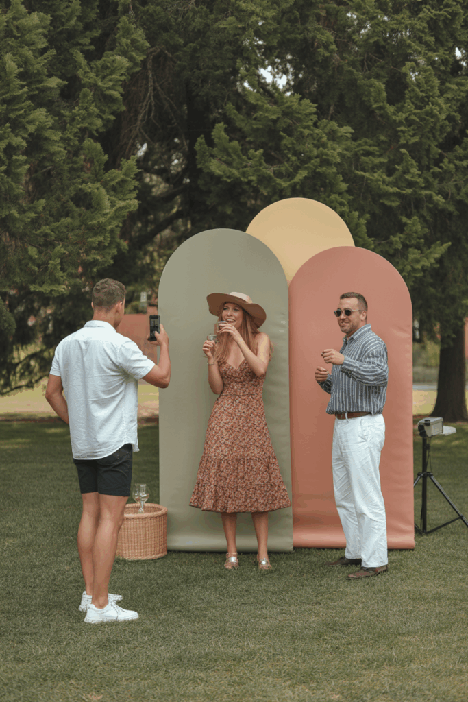 A photo booth can be a highlight of any outdoor party. It adds a fun element and gives guests a chance to capture memories. In the image, we see a well-decorated booth with a charming backdrop and playful signage.