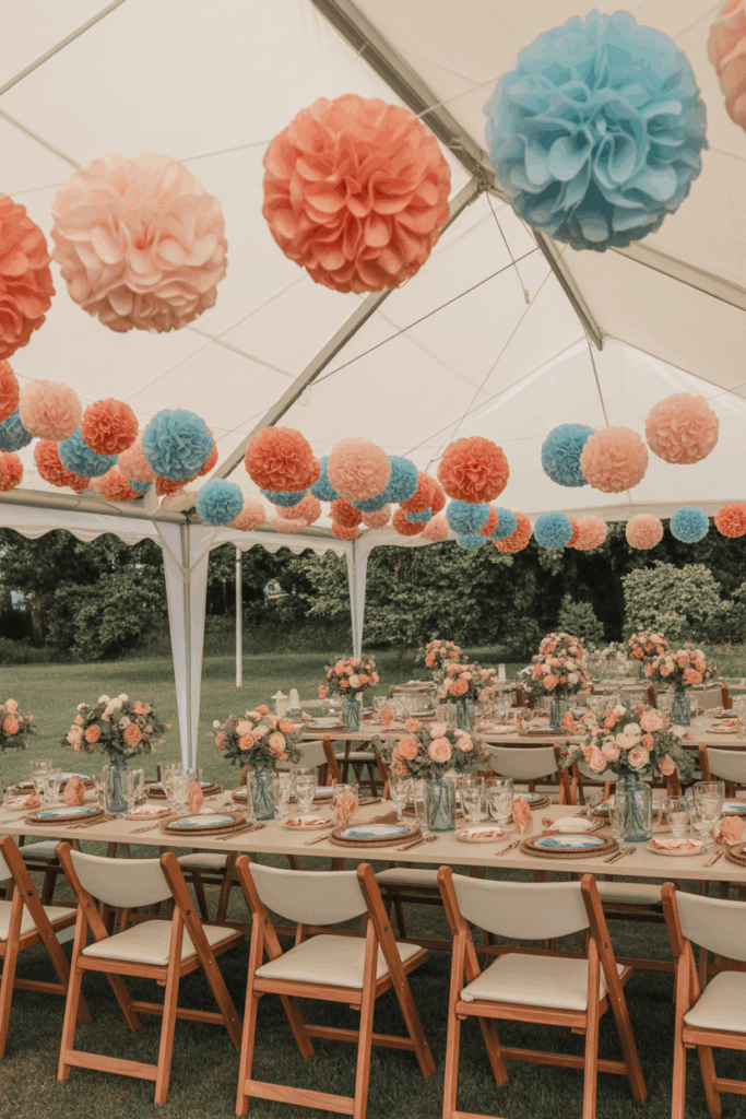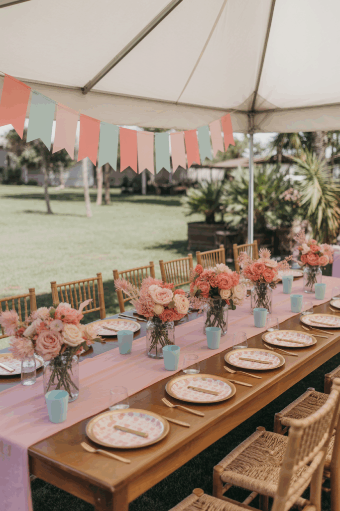 When planning an outdoor party, a coordinated color scheme can really set the mood. The image shows a vibrant setup with teal tablecloths, cheerful balloons, and lovely floral arrangements. These colors work together to create a fun and inviting atmosphere.