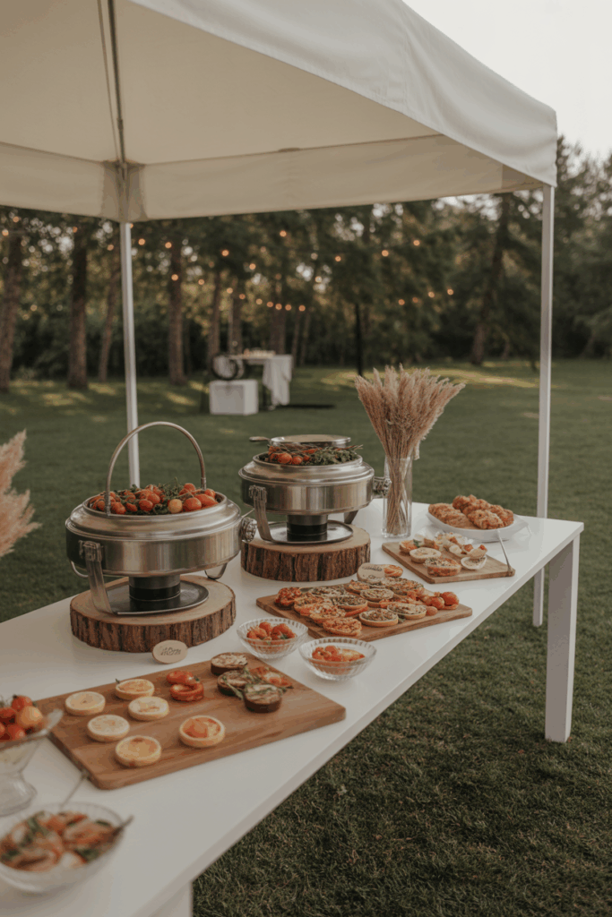 When hosting an outdoor party, having the right food serving stations can make all the difference. The image shows a beautifully arranged buffet setup, perfect for any gathering. With a variety of colorful dishes displayed, it invites guests to explore and enjoy.