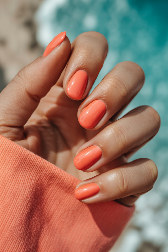 Bold coral glossy nails bring a bright and confident look. The shiny finish highlights the rich coral color, making it stand out. This style works well for those who want simple nails with a strong summer vibe. It pairs nicely with both casual and dressy outfits.
