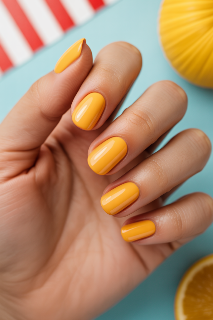 Bright orange nails suit summer with their lively and cheerful tone. A glossy finish adds shine that catches light and enhances the color. This look works well on all nail shapes and skin tones, making it a simple yet stylish choice for warm weather.