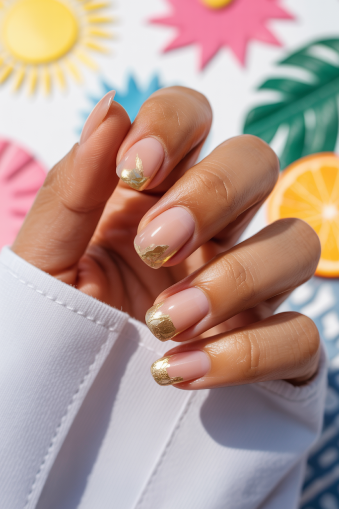 Clear nails give a clean and modern look. Adding one gold foil accent creates a subtle touch of luxury without being too bold. This design works well for any occasion, keeping nails simple but stylish. It is easy to maintain and looks elegant.