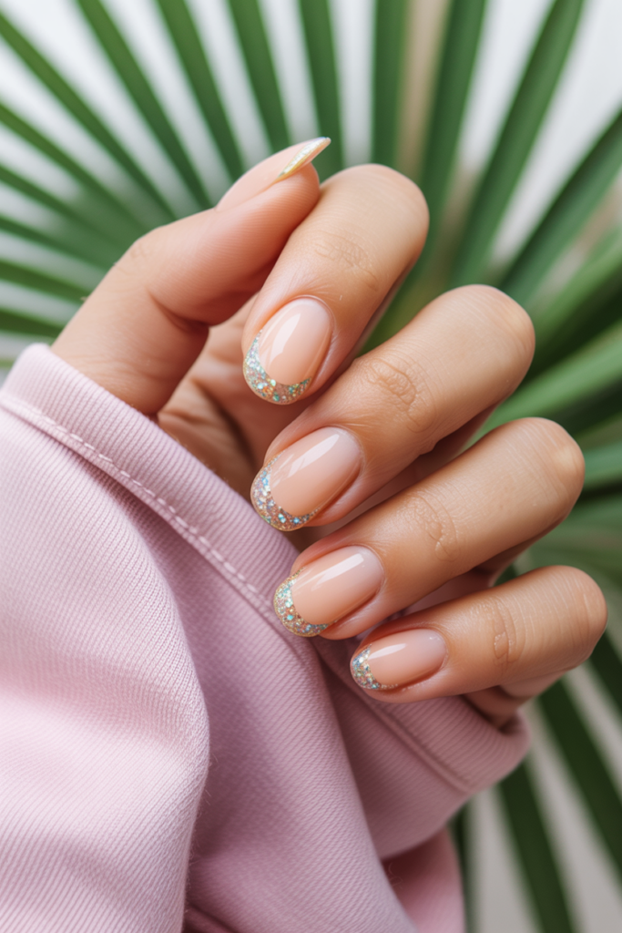 12) Creamy peach nails with delicate glitter tips