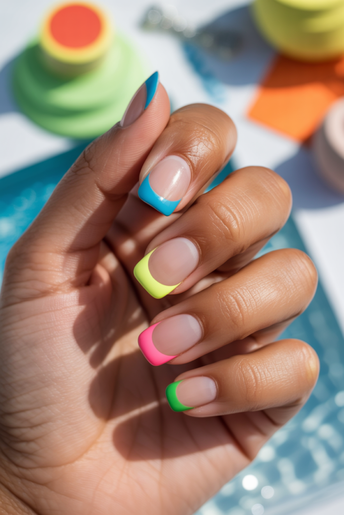 French tips with neon edges add a bright, modern twist to a classic look. The neon colors create a sharp contrast against a neutral or clear base. This style is simple but eye-catching, perfect for summer days when bold colors stand out.