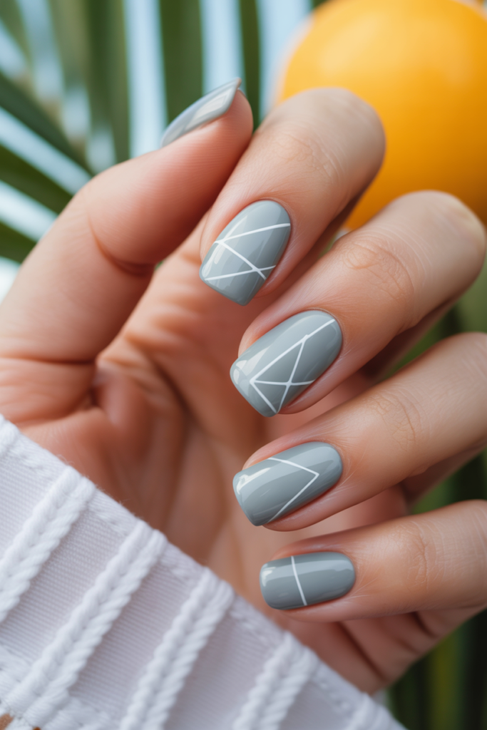 This design uses a soft light gray base for a clean look. Thin white lines create simple geometric shapes that add interest without being too bold. It works well for a summer manicure that stays elegant and modern.