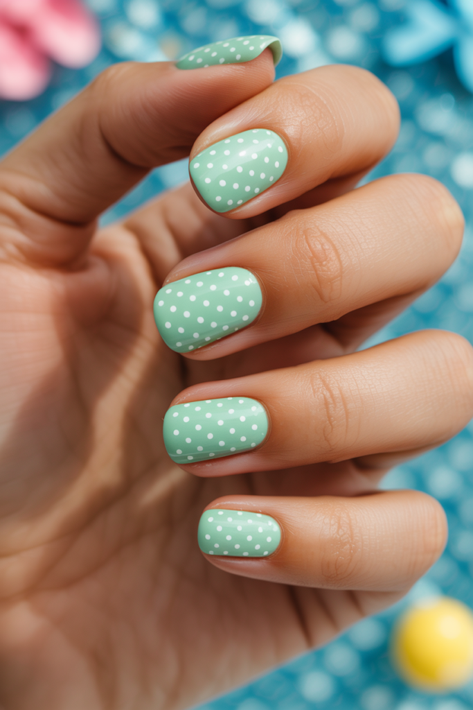 10) Mint green nails with tiny white polka dots