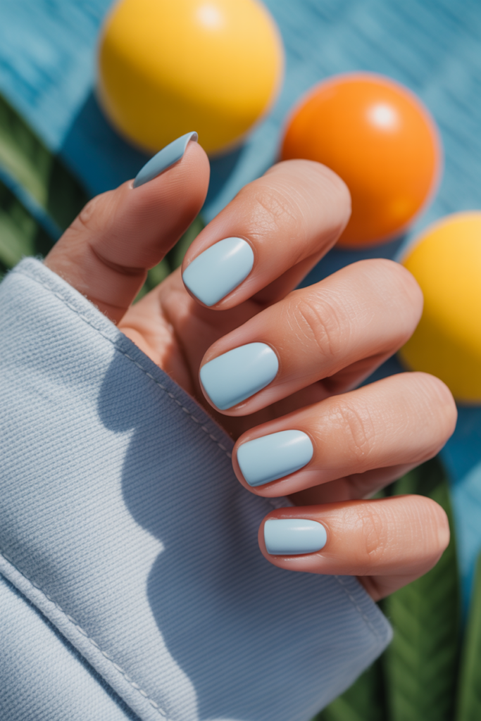 Pale blue nails offer a soft, calming shade perfect for summer. Adding a matte topcoat gives the nails a modern, velvety finish. This look works well for both casual and formal settings, balancing simplicity with style. It pairs nicely with light, floral outfits.