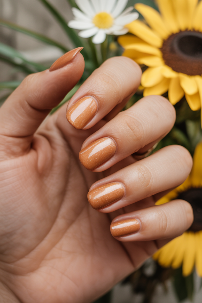 17) Glossy warm tan nails with fine shimmer