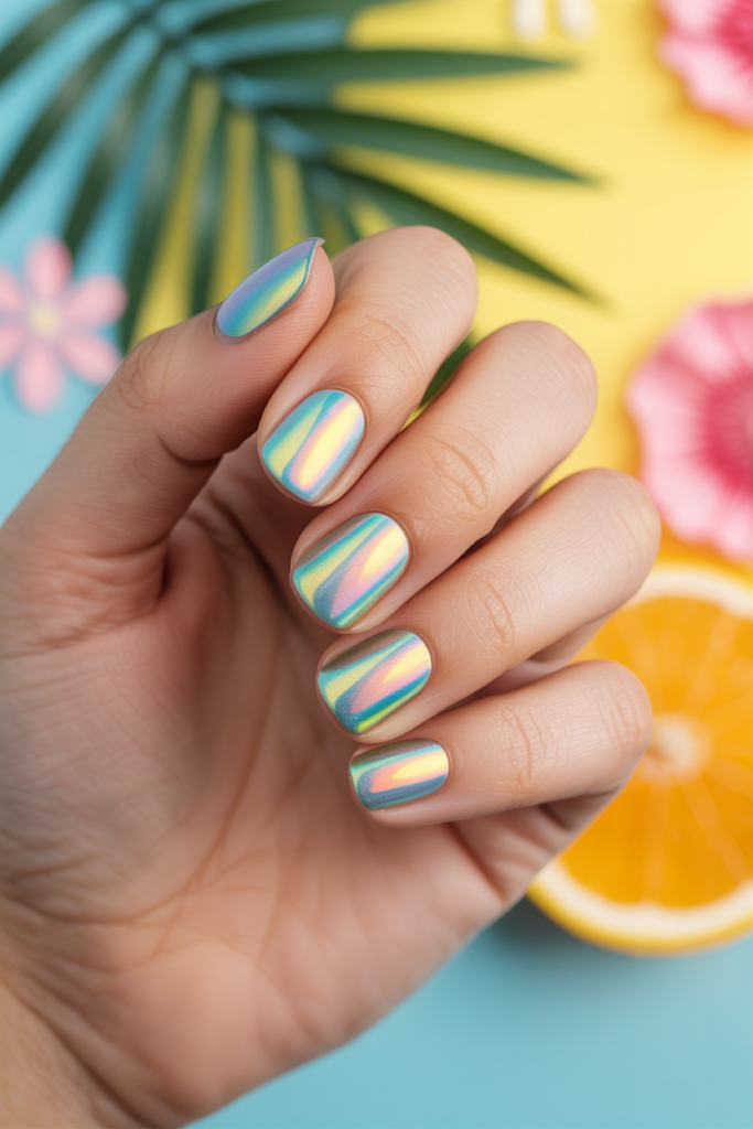 Short nails with an iridescent chrome finish offer a sleek, modern look. The shiny surface catches light, creating a subtle shimmer that changes with movement. This style is easy to maintain and works well for both casual and formal occasions. It adds a fresh touch without being too bold.