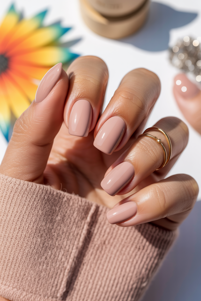Short square nails in nude mauve offer a subtle but stylish look. This color blends soft pink and brown, making it neutral and versatile. It suits many skin tones and fits well for both casual and formal occasions. The shape keeps nails neat and easy to maintain.