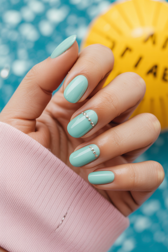 This design uses a soft aqua base for a fresh, clean look. A single small silver dot on each nail adds a subtle shine without being flashy. It’s an easy way to make nails stand out while keeping the style minimal and neat.