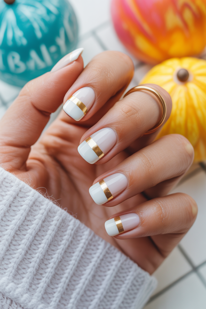 7) Simple white nail with a single gold stripe