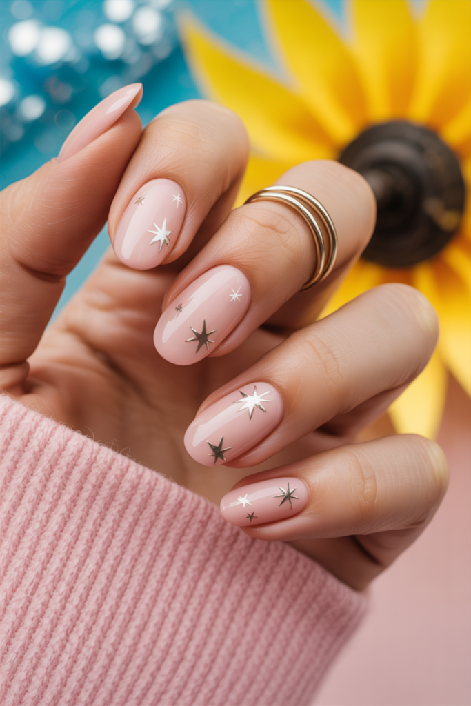 Soft pink gel nails offer a clean and polished look. Adding small silver stars gives a subtle sparkle without being too flashy. This style works well for both casual and formal settings. It is simple, elegant, and easy to wear all summer.