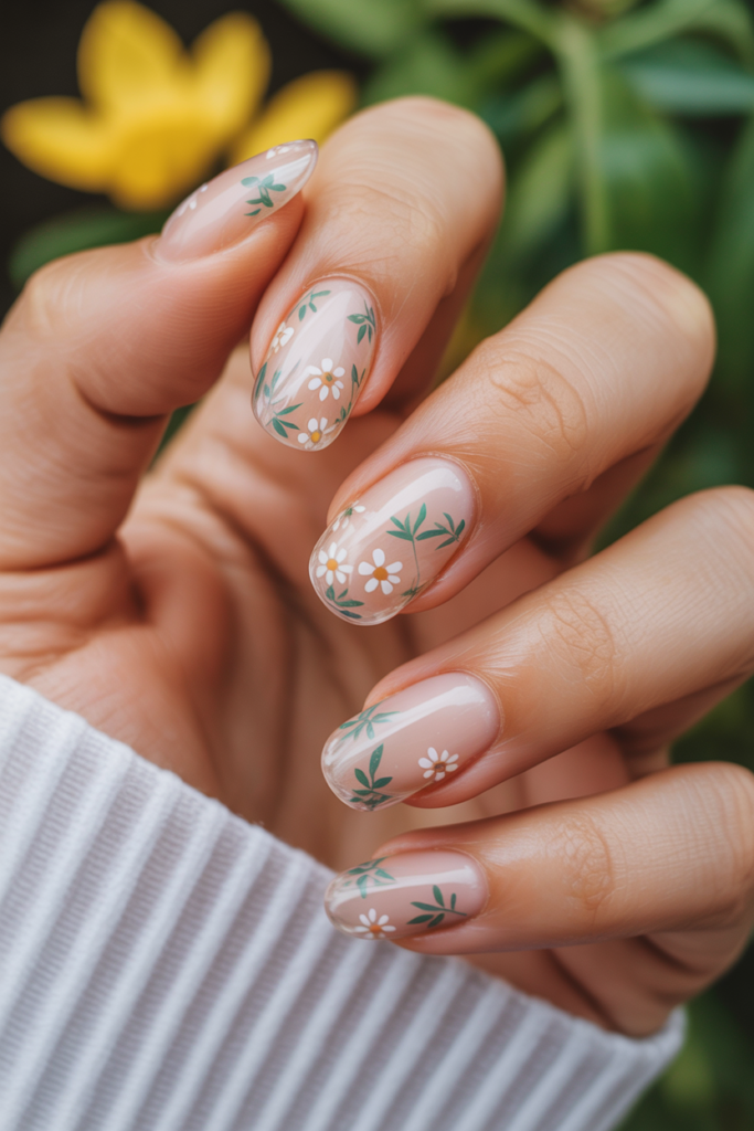 8) Transparent nails with small floral decals