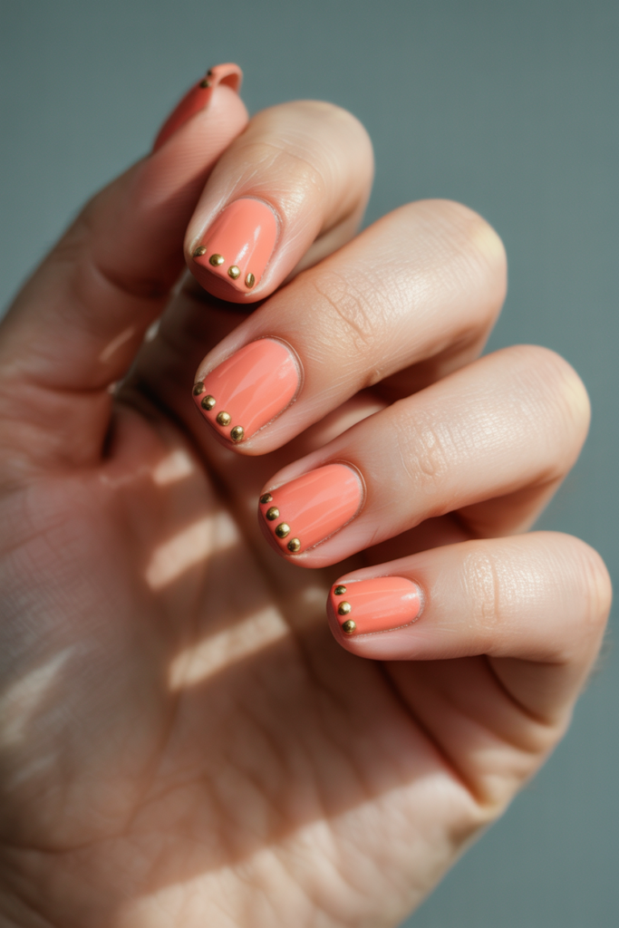 This nail design pairs a soft, muted coral base with small gold studs for a subtle touch of shine. The gold accents add a simple, elegant detail without overpowering the look. It works well for both casual and dressy occasions.