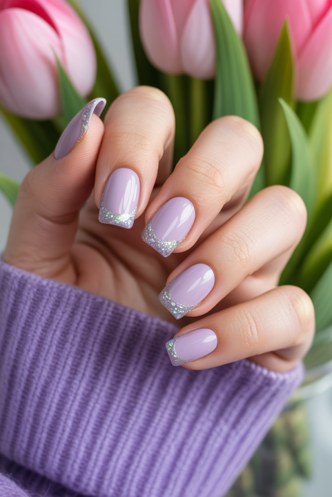 This nail design pairs soft lavender polish with silver glitter on the tips. The glitter adds a subtle shine that complements the gentle purple shade.
