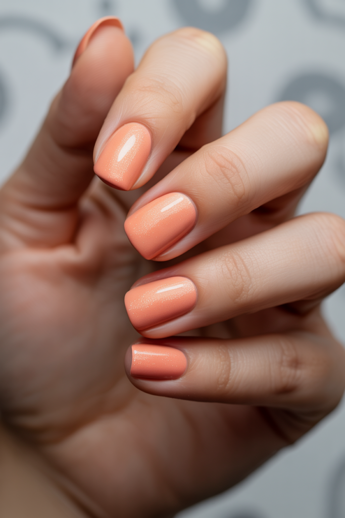 Peach nails with subtle shimmer offer a soft, elegant look. The shimmer adds gentle sparkle without being too flashy. This style works well for both casual and formal occasions.