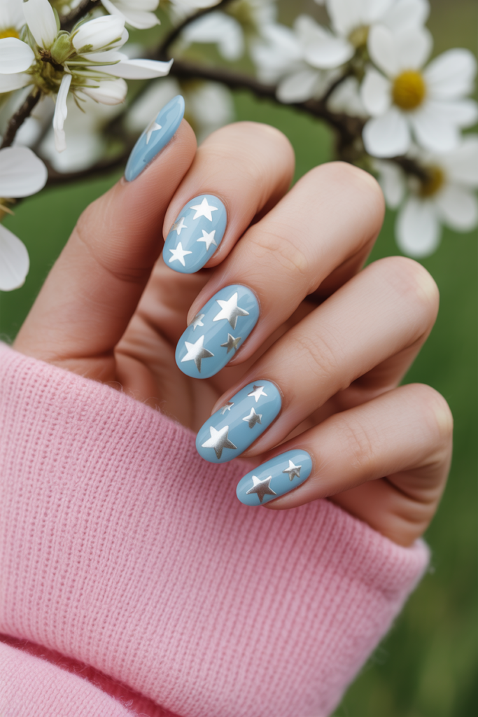 This design pairs soft baby blue polish with small silver star stickers. The stars add a simple shine without being too flashy.
