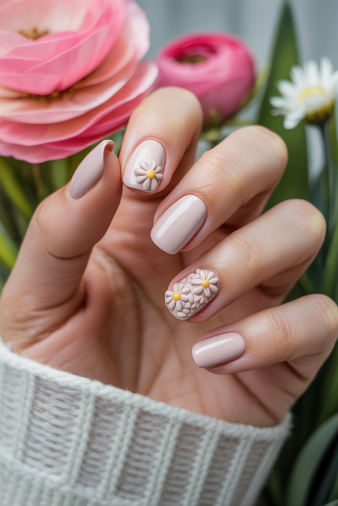 Blush pink nails offer a soft, elegant base that suits many styles. Adding 3D floral appliqués creates a textured, eye-catching effect. This combination is both delicate and stylish, perfect for March’s fresh, spring vibe. It works well for both casual and formal looks.