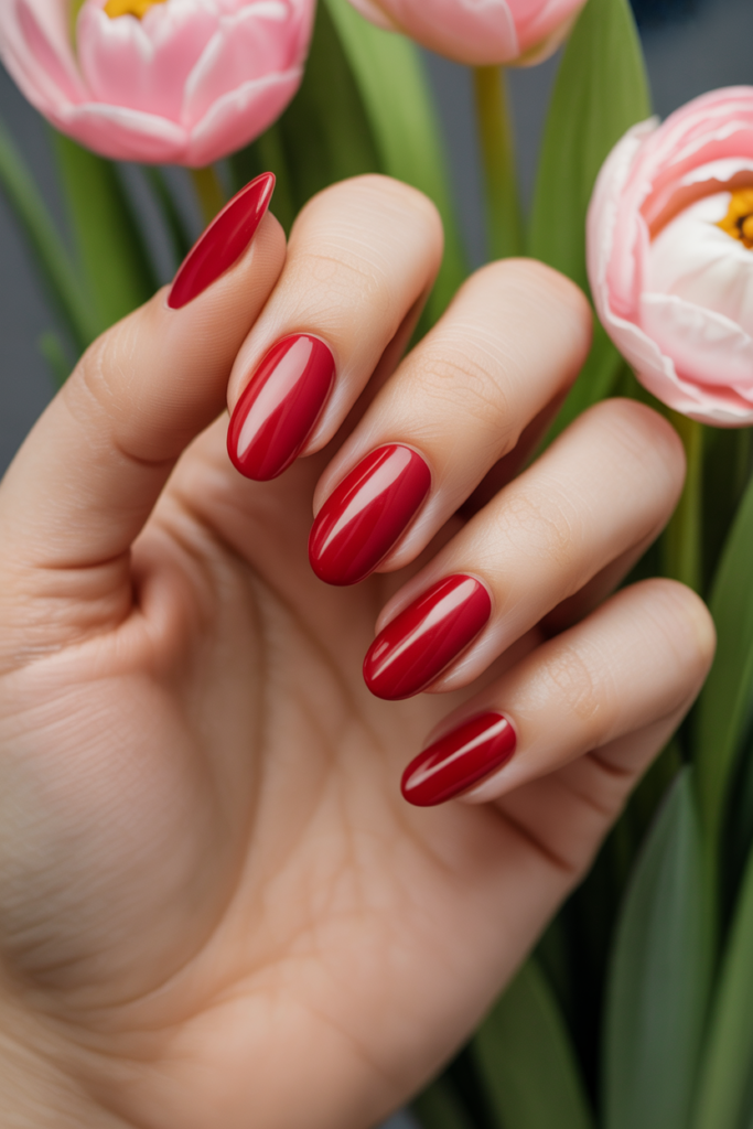 Classic red oval nails offer a timeless look that suits many occasions. The oval shape softens the hands and highlights the nails’ natural elegance.