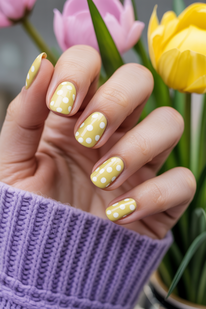 This design features a soft, creamy yellow base paired with white polka dots. It offers a subtle, fresh look that suits early spring. The pattern is simple yet stylish, making it easy to wear for everyday occasions or special events.