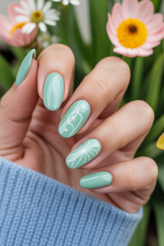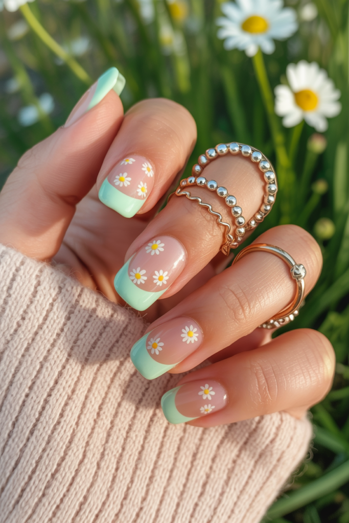 This manicure features soft mint green French tips on a natural base. Tiny daisies are hand-painted on accent nails, adding a delicate touch. The look is simple but fresh, perfect for early spring and those who like floral details without too much complexity.