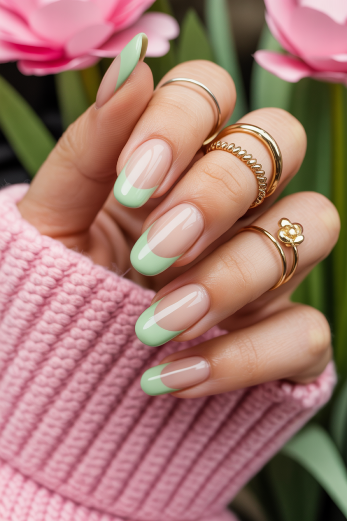 This nail design features a smooth, glossy nude base that looks clean and simple. The pastel green tips add a soft pop of color without being too bright. It works well for anyone wanting a fresh, subtle look for March.