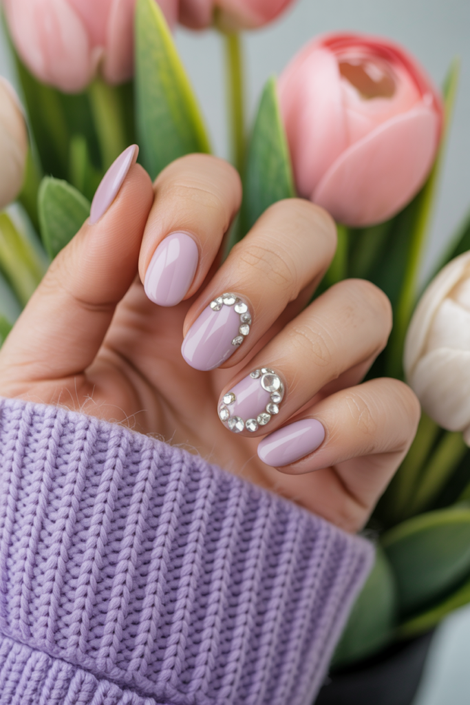 Light mauve nails create a soft, elegant base that suits many styles. Adding crystal embellishments gives a subtle sparkle without being too bold. This combination works well for both everyday wear and special occasions. It balances simplicity with a touch of glamour.