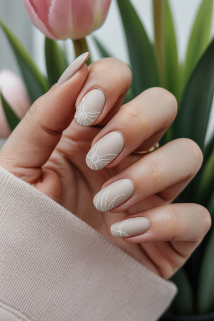 Matte beige nails create a soft, understated base. Adding thin white line art brings subtle detail without overwhelming the look.