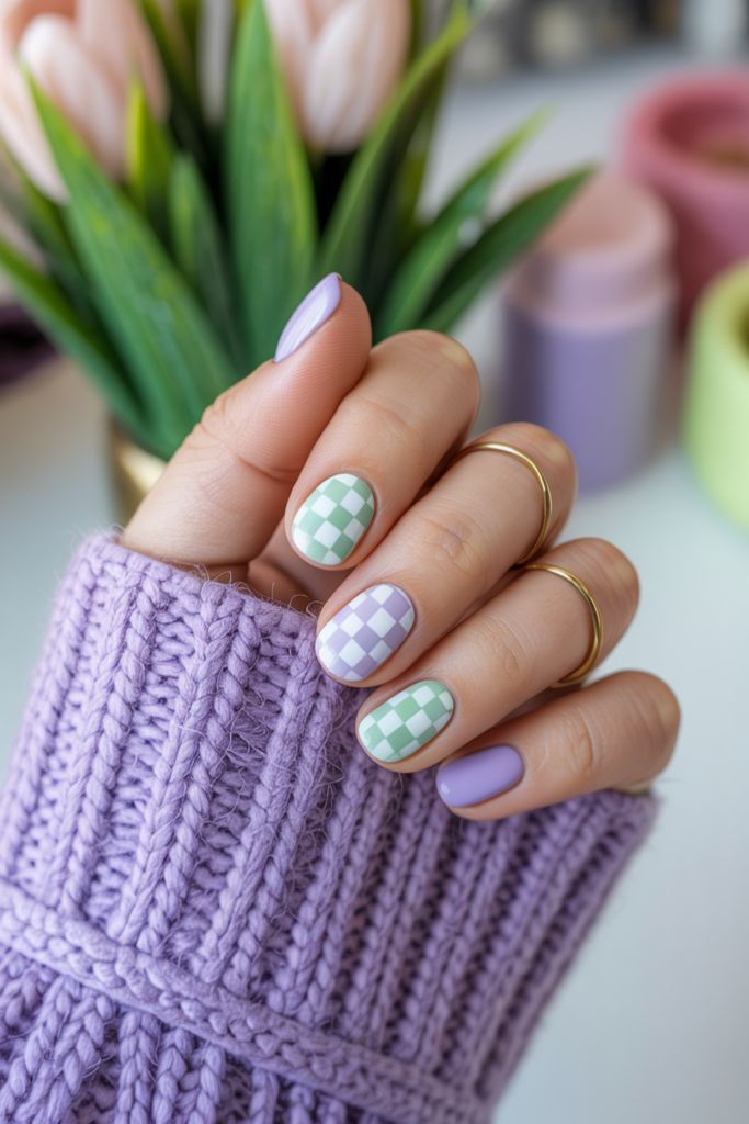 This design combines soft pale lilac with mint green in a checkerboard pattern. The colors work well together, creating a fresh and stylish look.